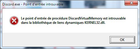 J'ai regardé rapidement, malheureusement toutes les réponses pointent vers la fin de vie de Windows 7, ça ne concerne pas que Discord... et je crois reconnaitre l'interface du meilleur windows de l'histoire sur ton screenshot Edit : sur la page officielle de discord, tout en bas à droite, tu peux télécharger une version compatible Windows 7 https://discord.com/download Mais comme ils disent eux mêmes : dispo jusqu'à Juin 2024 Bonjour MajorBug. Merci de ta réponse et de tes explications. Effectivement, j'utilise principalement Windows 7 pour mes habitudes en bureautique. Je vais essayer le lien que tu m'as indiqué. Mais je vais aussi essayer d'installer Discord sur la partition Windowss 10 que j'utilise pour DCS et FS2020. Encore merci de ton explication. Skander. Ce message a été modifié par Skander - 17 Apr 2024, 06:49. --------------------