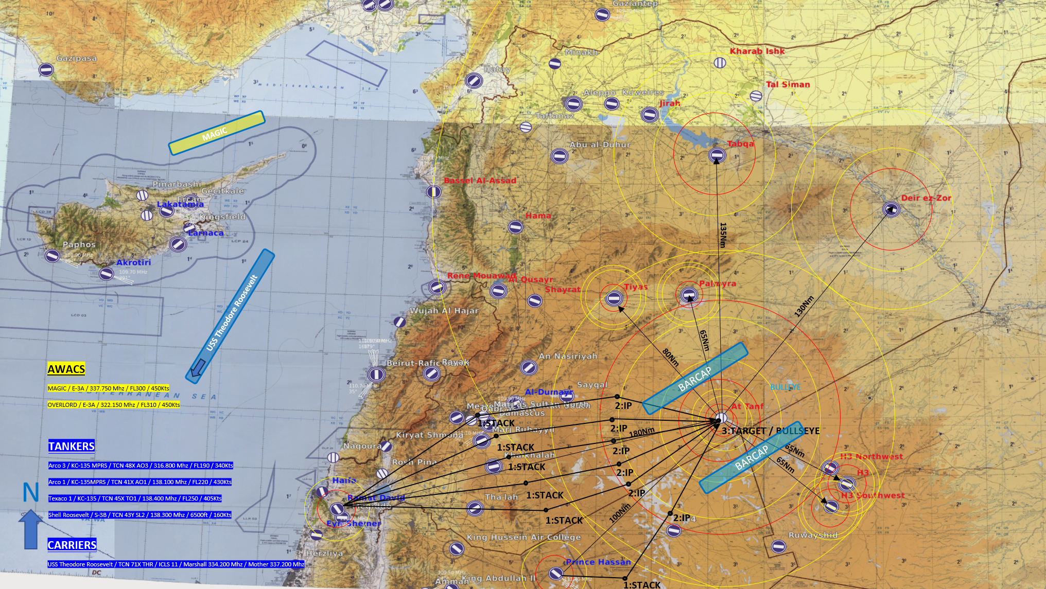 En CAP : Viking + Thunder Les Thunder partent avec quelques bombes pour fermer les 2 H3 actives, histoire que les CAP se fassent ensuite en TARCAP plutôt qu'en BARCAP et face au nord/est = seul axe de menace restant durant 1h. ++ Az' --------------------