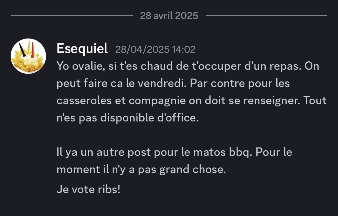 Non , j'ai pas eu de message. Je dois avoir une réponse aujourd'hui parce qu'avec le pont du 1er Mai il faut que je commande maintenant. C'est des grosses cuisses et il en faut 4 ou 5 selon le poids... Je pense aussi qu'il vaudrait mieux les consommer le jeudi ou le vendredi (max), la volaille se conserve moins bien que la viande rouge ou la saucisse. Merci de me confirmer officiellement... Si Miniature(s) jointe(s) --------------------