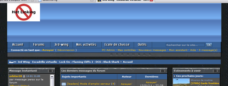 Ezor s'occupe de basculer le code du site vers le nouveau répertoire demain. C'est fait, merci @ Coin. Vous pouvez donc uploader vos bannières, et/ou en reprendre d'anciennes pour des dates futures, ce sera pris en compte. Comme d'hab, signalez ici vos ajouts/modifs, et faites gaffe à ne rien écraser Je commence : bannière d'aujourd'hui (15/01) reprise d'une ancienne avec MàJ sur le nouveau template sdk_banniere_BS.psd pour avoir le logo du 319th. Si vous avez des soucis d'affichage des bannières sur le site, merci de me le signaler (MP), pour l'instant le referer 3rd-wing.net est obligatoire pour "passer" (i.e. pas de referer = pas d'accès). Après test, ça donne ça : Si vous obtenez ceci à la place de la bannière => MP me, qu'on en discute ++ Az' Ce message a été modifié par Azrayen' - 15 Jan 2011, 12:56. --------------------