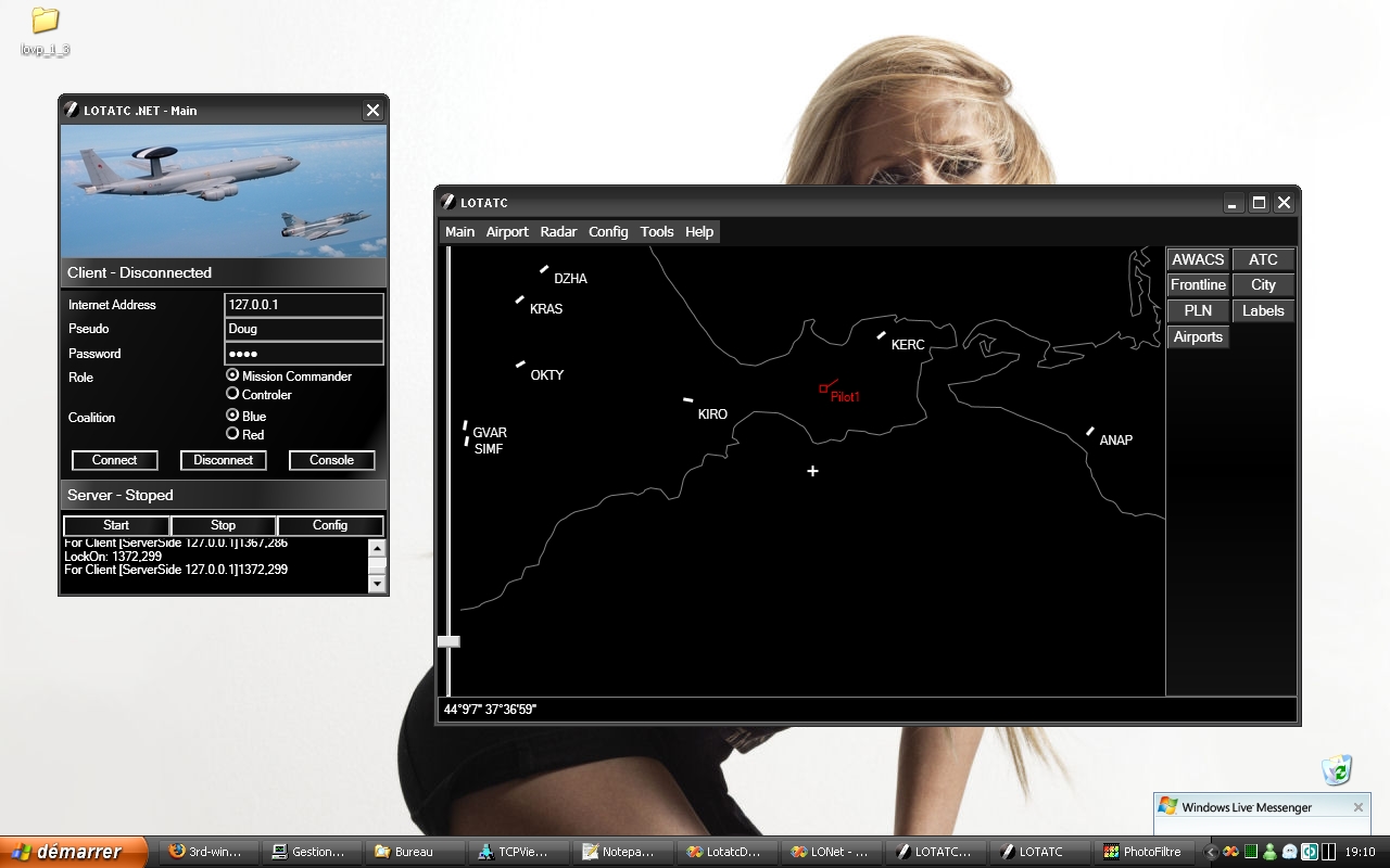 Une screenshot de la fenêtre principale qui permet de lancer un terminal LOTATC et/ou un serveur LOTATC. Il me reste encore du travail dessus. Diverses retouches pour que ce soit plus beau s'imposent. ![]() A noter donc que tout se fait a un seul endroit. Le serveur et le client ne sont pas séparer comme avec LOTATC 1.0. --------------------