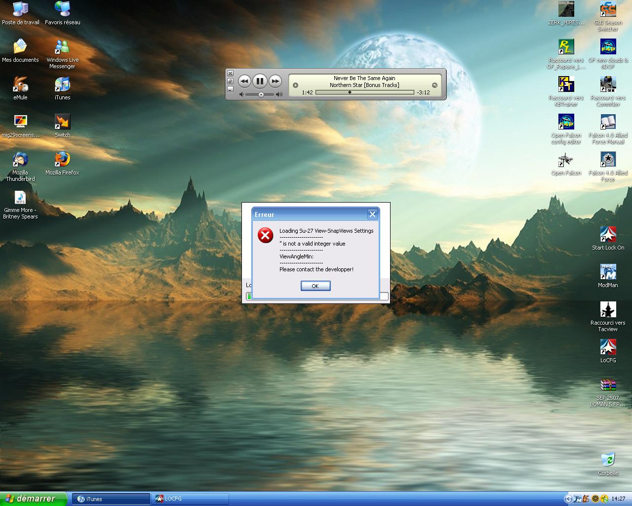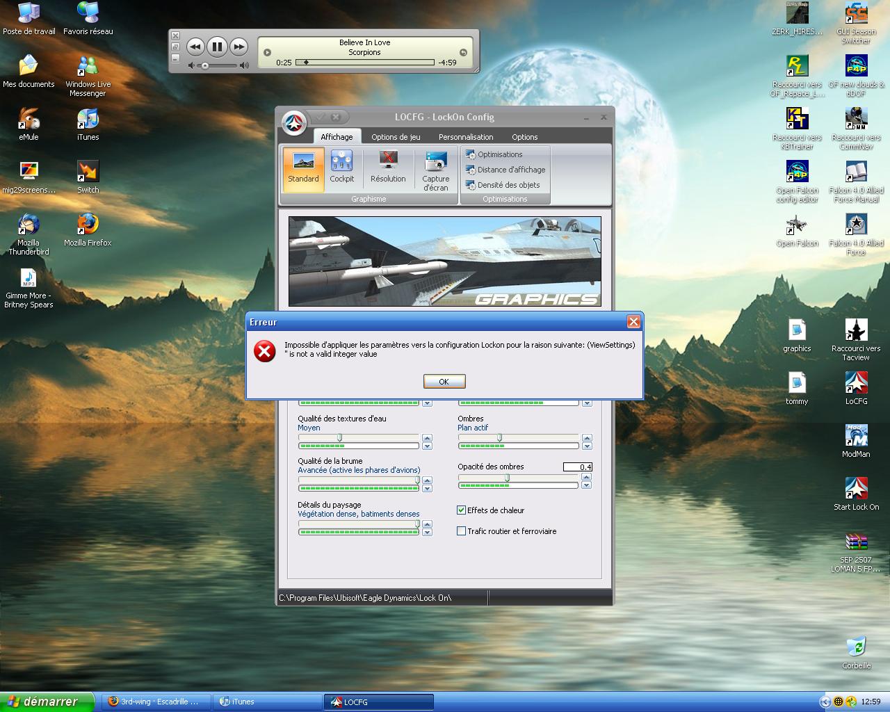 salut j'ai depuis hier un petit probl'me aprés l instalation du nouveaux fps tweaks dispo sur lockon files j 'ai quelques screens pour visualiser la chose et si quelqu'un a une idée car moi je séche Certains fichiers des FPS tweaks sont buggés. Dans le cas présent il faut que tu restaures le fichier view.lua par défaut. (soit en allant dans l'outils de sauvegarde de LOCFG soit en copiant le fichier view.lua fournit avec LOCFG dans le répertoire défaut vers le répertoire Config de Lock On) |