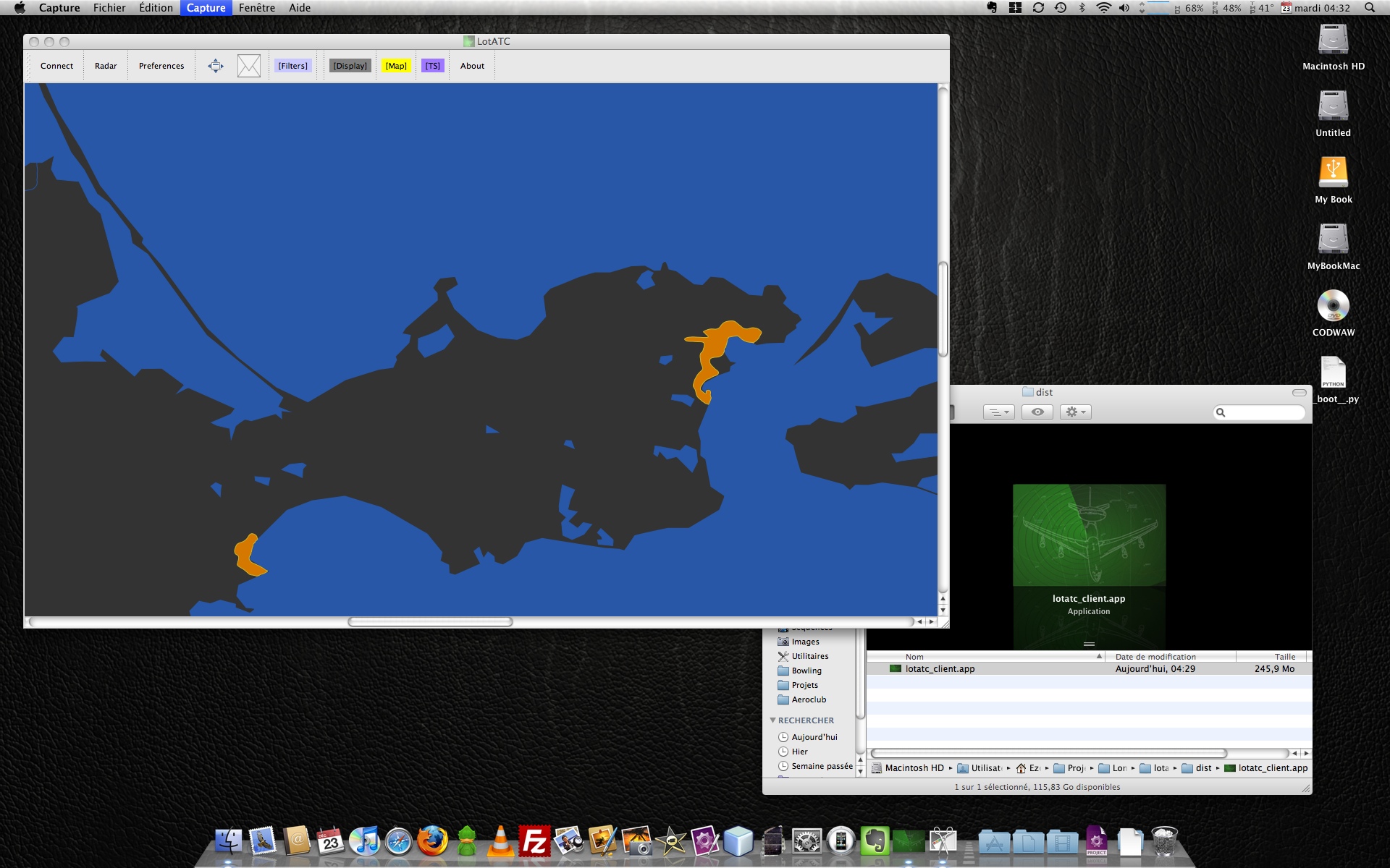 Ca déchire ou bien ? J'ai eu du mal mais j'ai réussi ! En fait je me suis rendu compte que ma façon de procéder n'était pas bonne pour la compilation (setup.py incorrect etc...) et que l'application que je réalisais ne pouvait fonctionner que chez moi ! Bon sinon maintenant ça compile en une ligne de commande, on modifie un fichier dans le package et roule mimile (je posterai les détails plus tard sur ton wiki si tu veux). Mon app (c'est l'extension des applications sous mac) fait 245Mo, c'est pas léger, aux images de la carte il faut ajouter toutes les librairies Qt (je me suis pas embêter j'ai tout mis) et vu les dépandances dans tous les sens, le package contient également "common", "lome", et "lotatc_server" ! Autant dire qu'on doit pouvoir optimiser, mais l'essentiel est là, ça fonctionne |