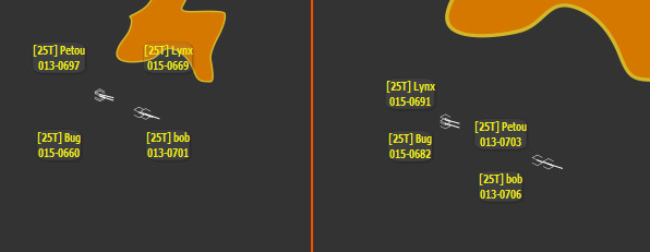 CITATION - gestion plus intelligente des priorités (genre alphabétique FA-1 avant FA-2 ). - Ne pas groupez les amis avec les ennemis? - Distinguer par une quelconque façon les groupes (couleur, traits..) - mettre un trait entre chaque étiquette et contact... - double-click affiche une version avec toutes les étiquettes visibles... - les étiquetés doivent à mon sens posséder un trait neutre et fin vers le symboles comme la V1 - leur positionnement doivent être calculé de façon à se situer sur le demi cercle arrière par rapport au sens de déplacement. (C'est clair) comme IRL. - idée sympa, à réaliser si besoin après les autres - oui, très bien vu. j'ai pas eu l'impression que ça le faisait, mais si c'est possible c'est effectivement à interdire - mhmmm je ne vois pas comment ce serait gérable simplement... pourquoi pas, mais non prioritaire selon moi. - oui ! superbe, ça permet de contourner tous les doutes, au moins jusqu'à une version finalisée et peut être même au dela - oui ! à voir comment (finesse, couleur) ne pas le confondre avec autre chose (VV) surtout si chevauchement possible de groupes différents - ah ! je ne savais pas pour le 1/2 cercle AR, c'est effectivement très "logique". A voir la codabilité et la priorité par rapport aux autres règles de gestion d'affichage, mais ça me plait bcp ! Finalement, j'ai mis en place cette technique. Si les targets sont groupés, on ne voit qu'un seul contact. Du coup, c'est moins précis pour le nombre de contacts, mais plus clair.... Je vais mettre une option pour cette feature, comme cela vous pourrez comparer... Excellent ² ++ Az' PS : Pour la question des pistes, la modif des cartes requiert-elle une livraison applicative ou un "simple" update (BMP ?) => pour savoir s'il faut corriger ce point (donc te filer un coup de main) avant la 2.0.3(4) afin de pouvoir mettre ça en service sur le dédié ? --------------------