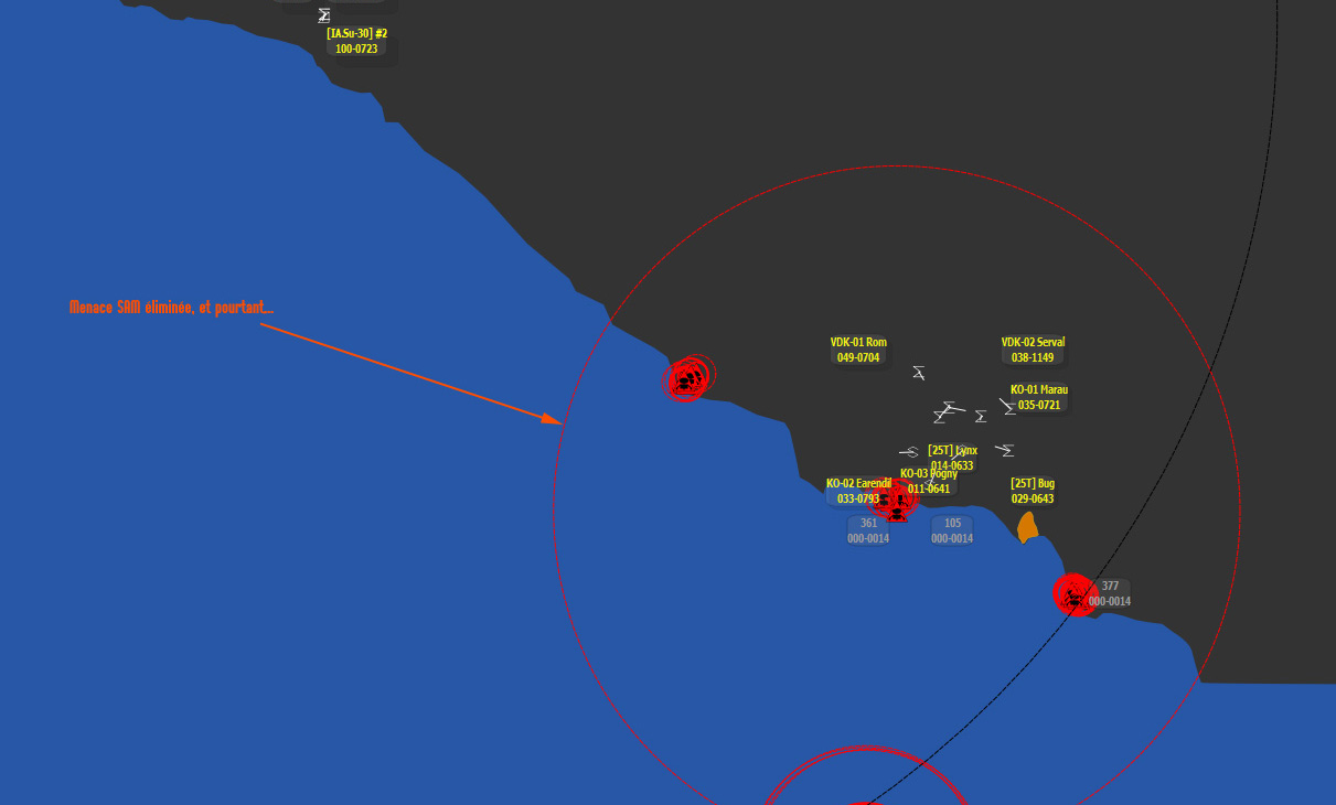 1/ les étiquetés doivent à mon sens posséder un trait neutre et fin vers le symboles comme la V1 ensuite leur positionnement doivent être calculé de façon à se situer sur le demi cercle arrière par rapport au sens de déplacement. (C'est clair) comme IRL. 2/ il faut que les radars des sam, c'est la seul info electro magnétique que l'on intercepte. Ceci pour les systèmes complexes. 3/ là c'est certainement lié au bug du réglage serveur . quoiqu'il en soit le principe c'est de visualiser l'enveloppe totale de tous le radars dispos et que le soft retire cette visu lors de la destruction d'un de ses composants, comme dans la V1 4/ m'en fout mais si c'est utile pour certains , ça vaut le coup de la reprendre. 5/ C'est à mon sens LE point bloquant pour l'utiliser réellement sur le dédié. C'est ingérable sans ça. Priorité absolue pour moi. Si vous n'avez pas le temps de modéliser tous les taxis faites au moins les pistes ( orientations et longueur , comme sur la V1, plein de tarrain ne sont matérialisés que par un trait. 6/ ha oui ! |