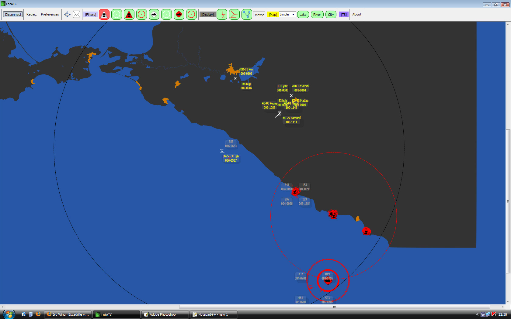 1) L' algo fait que si des targets sont assez rapprochés, je groupe les labels. Ces groupes peuvent avoir 2 targets -> 2 étiquettes, 3 targets -> 3 étiquettes, 4 targets -> 4 étiquettes,plus de 4 targets -> toujours 4 étiquettes. Ensuite, leur positionnement est centré sur le barycentre de toutes les targets (pour avoir un truc un peu centré). Pour l'instant, aucune priorité sur les labels à affichés ou pas. De plus, j'adapte automatiquement les distances des étiquettes en fonction de l'éloignement max par rapport au barycentre (vous n'êtes pas trop paumés??? DONC: ce que l'on peut encore améliorer (car je pense que le principe est validé, ça marche assez bien) (ce sont des idées): - gestion plus intelligente des priorités (genre alphabétique FA-1 avant FA-2 ). - Ne pas groupez les amis avec les ennemis? - Distinguer par une quelconque façon les groupes (couleur, traits..) - mettre un trait entre chaque étiquette et contact... - double-click affiche une version avec toutes les étiquettes visibles... A creuser. 2) Why not, il faut juste que l'on se fixe un règle clair, car pour nous le lanceur et le radar sont deux éléments distincs, après dire que si le radar est détruit on enlève le lanceur peut être un truc à creuser.... 3) La 2.0.2 à un bug découvert ces derniers jours qui fait que les AWACS dynamiques sont mal gérés (regression). C'est évidemment fixé dans la 2.0.3. Cependant, ce que l'on voit dans lotATC est l'ensemble des contacts radars issues de la somme de tous les radars de la coalition. Quand tu sélectionnes un radar dans la liste des radars du client, c'est uniquement visuel et ne fait que te montrer la position et son cercle de détection max. Cela ne change rien à la détection. Pas de reconfiguration dynamique actuellement. Je l'ai bloqué sur la 2.0.3. Ce sera géré avec la 2.1.0, où il n'aura plus besoin de faire "start", ce sera automatique au lancement de l'appli serveur. 4) Je pense que tu parles plutôt du #57 ^^ Je vais voir , une fois la 2.0.3 sortie, je vais faire un bilan des choses à faire et décidé si une 2.0.4 avec quelques nouvelles features danc la #57 sortira. (ah... la gestion de projets....). 5) Comme dit à Rom, pas le temps de tout faire, j'ai commencé à modéliser l'aéroport de Sevostopol, mais je n'ai pas continué. Sur ce point, si quelqu'un veut aider à faire les aéroport je suis preneur, aucune connaissance de prog n'est nécessaire, ce n'est que du graphique. Pour info, la carte simple a été faite à la main par moi-même, rien que les contours m'ont pris +4h Je veux la faire évoluer, mais je ne peux malheureusement pas tout faire.... 6) OH MON DIEU, comment avons nous pu laisser cela!!!!!!!!!!!!!!!!!! 7) Pour les plantages, nous avons fixé quelques trucs, à tester largement avec la 2.0.3 pour validation, Pour la 2.0.3, au vu de la roadmap, nous avons très bien avancé, la majorité de ce que vous nous avez remonté était des bugs trivials, quelques régressions. Nous allons faire une passe sur les soucis de détections (même si le plus gros est fait). Dès que l'on juge prêt, on la sort. --------------------