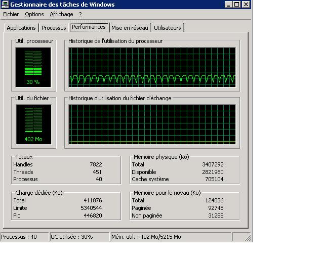 Le serveur est sur un AMD64 4000+ cadencé à 2.4Ghz avec 3.5Go de RAM Architecture W2003 serveur Entreprise Edition SP2 en 32bits Je lance le Serveur Lotatc seul (98Mo de Ram utilisé et 2% de processeur) Je lance la mission fournie (138Mo / 2%) Lors des tests suivants la charge en RAM reste identique 140Mo - test en réseau Local Connexion d'un premier client en bleu montée à 8% 2ème client la charge reste à 8% Connexion d'un client en rouge montée à 19% 2ème client en rouge montée à 21% On reste avec le nombre de client connecté mais je fais la poursuite des connexions clientes via Internet Connexion d'un autre client en bleu montée à 23% Connexion d'un autre client en red montée à 25% Je laisse la mission tourner quelques minutes et la charge de LOTATC monte jusqu'à 30% (de ce que me dit Dart surement à cause du nombre d'objets affichés, c'est con je n’ai même pas regardé Par contre la variation des charges processeur est très variable (cf. pièce jointe) Je redeconnecte tous les clients sauf 1 en local, et la charge redescend à 12% Voilà si besoin pour d'autres testes ne pas hésiter --------------------