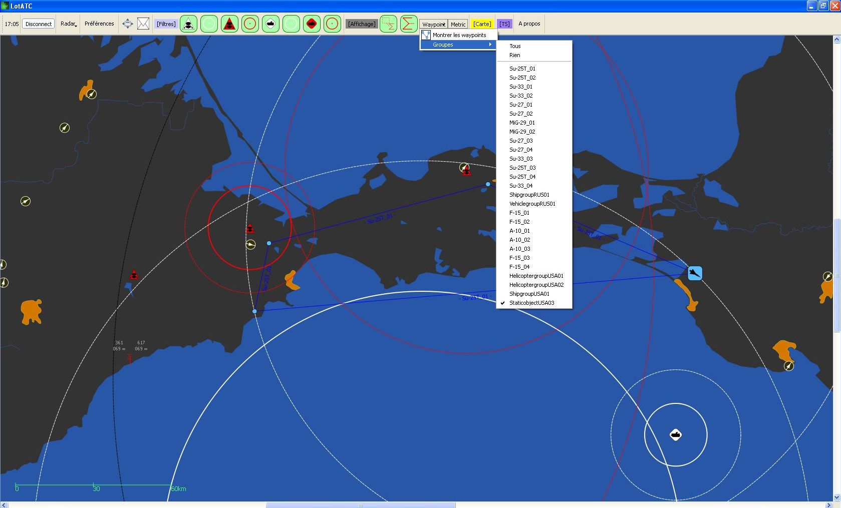Je me pause encore la question mais les cercles de détection de certains systèmes au sol sont-ils correctes ? Le S300 me parait super énorme.... Sinon je suis rentré dans une des fonctionnalités du soft jamais explorée pas mes soins auparavant ...... l'importation des Plans de vol de la mission et là pan comprends pas tout . voici ci-dessous le truc Un seul se visualise, celui des 25T ( le premier) même si j'en choisit un autre.... Comment ça marche, car dans le listing il y en a un paquet ? Peut -on en choisir 3 par exemple ou alors c'est un seul ou tous ? -La fonction rejeu marche au poil -Problème toujours présent le décalage des pistes LOTATC / Carte réelle du jeu. -Je sais que cela a été demandé mais à quand le petit "Paint "? -Un bug de visualisation du cercle létal du S300 -Un bug de visu des avions entre un awacs Statiques et celui du Jeu ... AZ' expliquera mieux que moi . Quoi on me dit qu'il ne veut pas .....!! Ok alors il a réglé le serveur sans awacs statique côté rouge avec seulement celui du jeu. Tout se passe bien sur la détection des avions ennemi jusqu'au moment où je me reco côté bleu et lui annonce qu'il y a plein des navions qu'il devrait voir. Effectivement ce zinc ne voit pas au delà de 150km (réglé 300). Si le serveur est reconfiguré en live avec un statique puis retiré; alors là l'awacs du jeu se met à détecter les avions à 300km Quid de la charge réseau Mr AZ' ? Au final , cette version passe super bien |