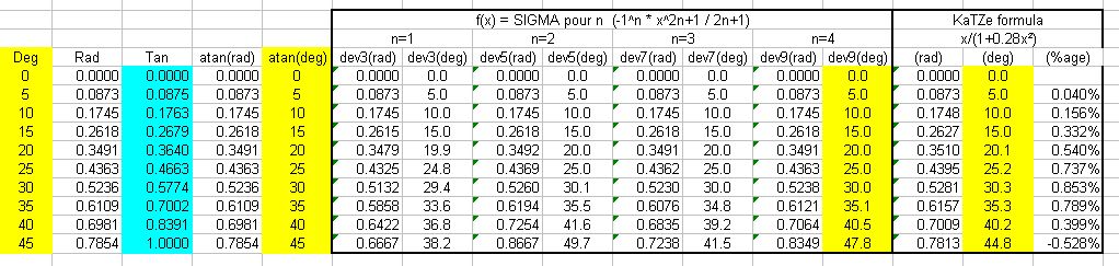 Pour finir sur une simplissime : atan(x) = x/(1 + 0.28*x^2) sur l'intervalle -PI/2 , PI/2 avec une précision supérieur à 1% et donc au demi-degré. Miaou Tu es certain de ta formule de développement limité pour atan(). De mémoire (et ça fait longtemps) c'est plus du genre: x -x^3/3+ ... --------------------